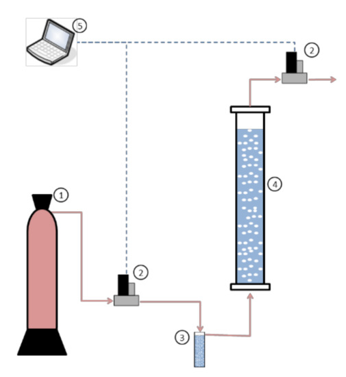 Carbon dioxide absorption studies were carried out in semicontinuous regime (continuous for gas stream and batch for chemical solvent) in a square bubble column contactor (4 cm in diameter and 65 cm in height) with a liquid phase volume of 0.9 L. The absorption rate was determined as the difference between inlet and outlet gas streams. Mass flow controllers (M-Series Alicat Scientific) were used to maintain a constant inlet gas flow-rate and to determine and record the outlet gas flow-rate. This type of measurement has an associated uncertainty in the range of 10%. Figure 1 shows a scheme of the experimental set-up employed to evaluate the behavior of these solvents for carbon dioxide absorption.