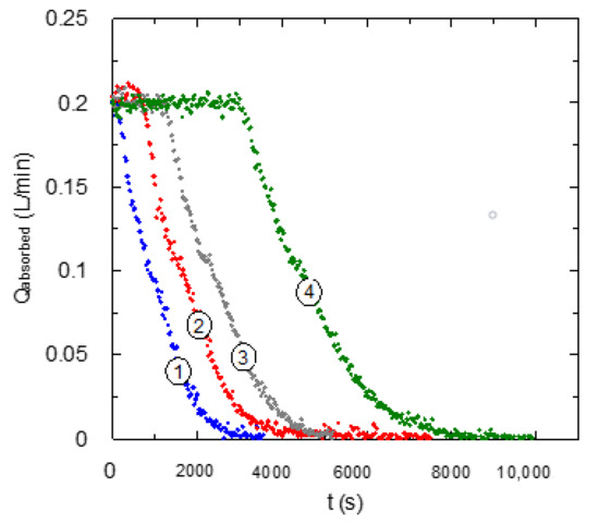 Influence of TMEDA concentration upon carbon dioxide absorption curve. QG = 0.2 L·min−1. ① CB = 0.1 mol·L−1; ② CB = 0.2 mol·L−1; ③ CB = 0.3 mol·L−1; ④ CB = 0.6 mol·L−1.