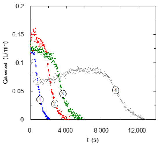 In carbon dioxide separation by chemical absorption the analysis of solvent stability during absorption/regeneration cycles is important. For this reason, several absorption/desorption cycles have been carried out in order to detect a lost in absorption capacity that could indicate the existence of solvent degradation. The experimental data corresponding to the carbon dioxide absorbed flow-rate are shown in plot A of Figure 9. It is possible to observe a comparison with the experiment using fresh solvent. A decrease in absorption rate and also in the value of the area under the curve is detected. This type of behavior is commonly observed for chemical solvents in carbon dioxide absorption processes [27,28]. This decrease in carbon dioxide loading is produced due to limitations in the acidic constant that does not allow the complete reversibility of the chemical reaction. After the first regeneration, the absorption curves for other cycles show a very similar behavior and it indicates that this type of solvent has a suitable stability.