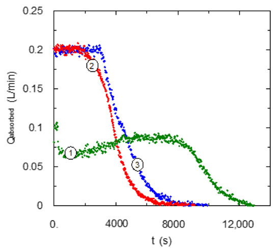 Influence of gas flow-rate fed to bubble column using EDA- and TMEDA-based solvents. CB = 0.3 mol·L−1 (0.6 mol·L−1 of amine centers) (①) QG = 0.1 L·min−1; (②) QG = 0.2 L·min−1; (③) QG = 0.3 L·min−1.
