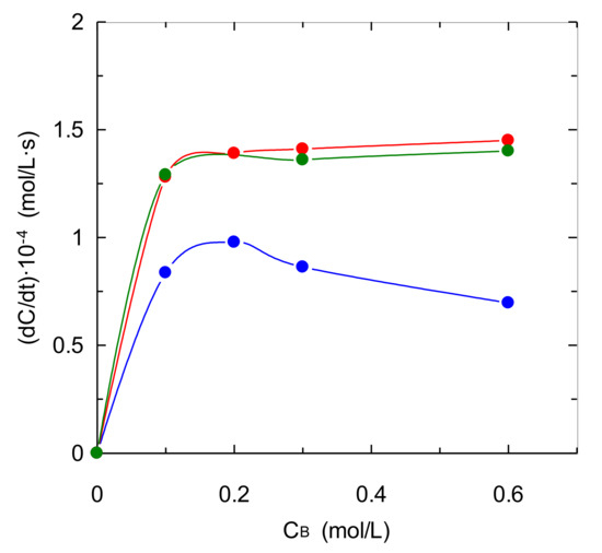 The behavior shown by aqueous solutions of TMEDA is not a commonly observed characteristic, because an increase in concentration generally causes an increase in mass transfer rate, mainly at the beginning of experiments. It is produced by an increase in reaction rate due to the high amine concentration. This fact is clearer for tertiary amines because the reaction rate is generally low and an enhancement in this parameter causes a higher effect upon the overall mass transfer process. Taking into account this previous discussion, the behavior shown in Figure 3 for experiments with high TMEDA concentrations (that show lower absorption rates in the first part of the experiments) can be due to mass transfer steps. Specifically, an increase in amine concentration in the aqueous solution causes a significant increase in viscosity [20], and this fact can produce several negative influences upon gas-liquid mass transfer processes: