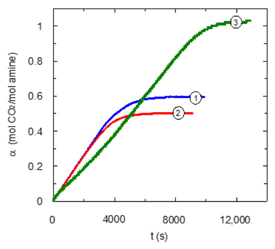 Effect of type of center of amino centers upon carbon dioxide loading. CB = 0.6 mol·L−1. QG = 0.2 L·min−1. ① EDA; ② DMEDA [13]; ③ TMEDA. The carbon dioxide loading has been calculated per mol of amino centers.