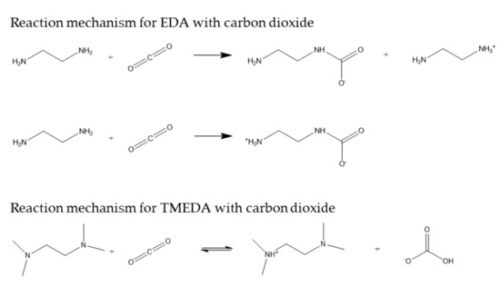 In a previous work of our research team [13], the behavior of aqueous solutions of dimethylethylenediamine (DMEDA) for carbon dioxide chemical absorption was studied. The aim of this work was to take advantage of the presence of primary and tertiary amino centers on the basis of previous studies using amine blends [14,15]. The present research is focused on the evaluation of diamines with the same chain length but with different natures in the amino groups, in order to analyze the interactions between amino groups and how they can influence the behavior of this type of compound in order to be used as chemical solvents for carbon dioxide separation. One of these amines is ethylenediamine (EDA), which is considered a promising carbon dioxide-capturing solvent [16].