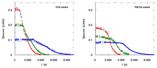 The experimental data corresponding to the carbon dioxide absorption flow-rate using EDA-based solvents (Figure 2) shows absorption curves with a similar behavior to the expected one for primary amines in aqueous solution. In the first part of the experiments, complete carbon dioxide absorption is produced due to the fast chemical reaction corresponding to this type of amines (primary) [17].
