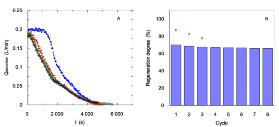 Figure 9B also shows a comparison between experimental data corresponding to the behavior in absorption–regeneration cycles of Monoethanolamine (MEA)-based solvent for carbon dioxide separation. For both solvents, a decrease in the degree of regeneration is observed with the use in the initial cycles, which is a commonly observed behavior [38].