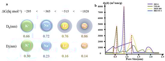 (a) Hydration free energy (ΔG), hydrated ionic diameter (Dh), and ionic diameter (Di) of different metal ions [19]; (b) pore size distribution of MOFs.