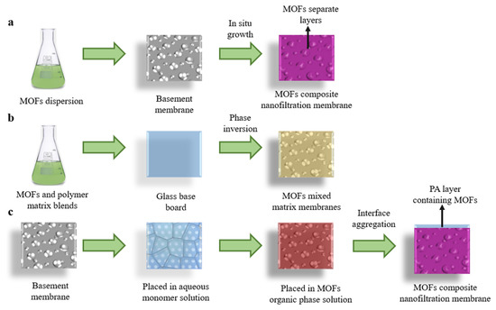 (a) Hydration and preparation of MOFs nanofiltration membrane by in situ growth. (b) Preparation of MOFs nanofiltration membrane by blending. (c) Preparation of MOFs nanofiltration membrane by interfacial polymerization.