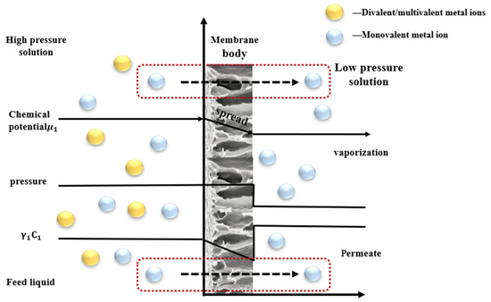 The section below provides experimental and theoretical references for developing MOFs-based membrane materials for lithium extraction from salt lakes. In recent years, nanofiltration technology has been widely used as an emerging and environmentally friendly membrane separation technology to deal with high Mg2+/Li+ ratio salt lake brine. Affected by steric hindrance and membrane pore sieving, the NF membrane retains more divalent/multivalent ions and passes more monovalent ions (Figure 8). Nanofiltration membranes based on MOFs have been widely used for metal ion separation in salt solutions [46], due to their ordered pore structure, tunable pore size, and modifiable functions [47,48]. With lithium being such an important mineral for sustainable development, extraction from salt lake brine utilizing MOFs nanofiltration membranes demonstrates excellent future prospects.