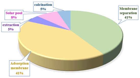 Figure 7 presents a thorough analysis of the literature pertaining to applications of various technologies for the separation of magnesium and lithium from brine: the solar cell method, precipitation method [39,40], ion exchange adsorption method, calcination leaching method [41], solvent extraction method, and membrane method [42]. Table 4 summarizes and compares the merits and demerits of the different technologies specific to its application to the separation of magnesium and lithium from salt lake brine [43,44].