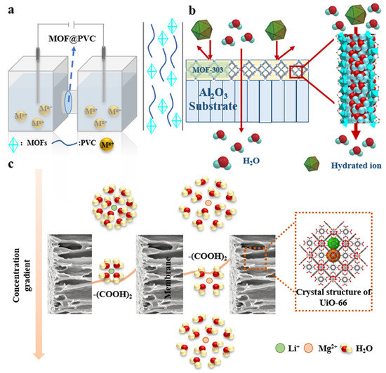 The separation performance of MOFs largely depends on pore size and structure [18]. The metal ions with different hydration diameters are known to exhibit different separation effects (Figure 2a) [19,20]. With loss of the Li+ hydration shell, the proportions of Li+/Na+, Li+/K+, and Li+/Mg2+ in the ZIF series are significantly larger than that in the UiO series. The pore size of MOFs plays an essential role in separating magnesium and lithium in brine, and MOFs with smaller pore sizes are more favorable in terms of the selective separation on the membrane surface (Figure 2b).