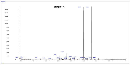 J. procera is a natural source of photochemical components that may have antioxidant, insecticidal, antibacterial, and anticancer properties. The methanolic extracts of the leaves and seeds of J. procera were subjected to GC/MS analysis, and the obtained results were published recently [24,31]. In this study, the root extract of J. procera was examined with GC-MS analysis for phytochemical component detection. The bioactive compounds in the root extract were identified using commercial libraries and a comparison of the mass spectra, match percentages, and retention times of the reference compounds. The recorded results of GC analysis reveal that the root extracts of J. procera are rich in phytochemical compounds. In this regard, J. procera is a natural source of phytochemical constituents with potential antimicrobial, insecticidal, anticancer, and antioxidant activities [4,5,6,32]. For accurate results, the methanol that was used as a solvent in the extraction process and the methanolic extract of the root of J. procera were examined with GC/MS analysis (Figure S2 and Figure 1). Then, the detected compounds in the plant sample were compared with the bank (methanol solvent) for bioactive compound identification. GC/MS analysis of the root extract showed about 20 bioactive components related to secondary plant metabolites with biological activity (Figure 1 and Table 1). These detected phytochemical compounds in the root extract of J. procera have antimicrobial, antioxidant, anticancer, and anti-inflammatory biological activities. For example, octanoic acid shows antimicrobial activity [33], while longifolene and undecanoic acid act as antifungal agents [34,35]. The extracted bioactive compounds of J. procera were effective and potent against SCC-9 cancer cells [36]. The phytochemical compounds highlighted above, other phytochemical constituents detected in the root extract of J. procera, and their biological activity are presented in Table 1. These results may support and justify the use of J. procera in traditional medicine.
