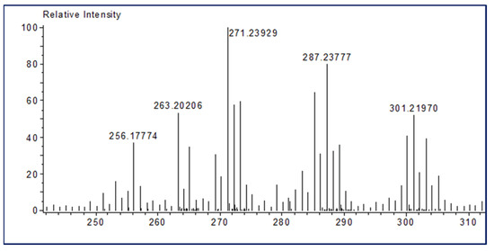 Direct real-time time-of-flight mass spectrometry (DART-ToF-MS) analysis (conditions: ionization ES+ − He; temperature, 250 °C; peak voltage, 500V). AccuTOF LC-plus from JEOL (Tokyo, Japan) was used for extracted sample characterization. Volatile plant extract compounds were evaporated in a stream of helium that had been heated to 250 °C, and ionized with the excited metastable helium atoms before entering the ion source of the time-of-flight mass spectrometer. In positive ionization mode, the molecules were mainly protonated without any fragmentation.