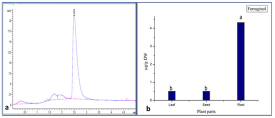 (a) Ferruginol standard (RT = 2.498); (b) concentration of ferruginol in different part of Juniperus procera. a,b different superscripts within the same column differ significantly (p < 0.05). Reported results represent the mean of three replicates ± standard deviation (SD).