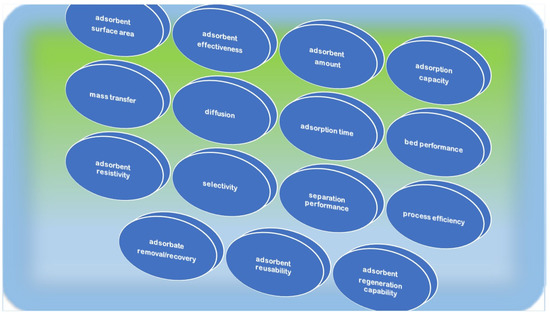 The intensification parameters (Figure 2) involved the adsorbent property, surface area of adsorbent, adsorbent effectiveness, adsorbent amount, adsorbent magnetization saturation value, magnetic separation performance, adsorbent reactivity, adsorption capacity, dynamic binding capacity, mass transfer, film diffusion, intraparticle diffusion, adsorption time, breakthrough time, length of mass transfer zone, fixed bed performance under subcritical conditions, adsorbent resistivity to high pressure and temperature, selectivity, selective adsorption capacity, separation, separation performance, process efficiency, adsorbate recovery, adsorbate removal, adsorbate removal efficiency, adsorbate removal percentage, adsorbate removal yield, adsorption yield, adsorbate removal rate, effect of process parameters (pH, adsorbent dosage, initial adsorbate concentration, acid concentration, contact time, temperature), adsorbent reusability, adsorbent activity and adsorbent regeneration capability.