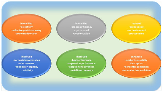The process improvements accomplished through PI related to the investigated studies are presented in Table 2. In the applications discussed, either one or more techniques were applied as intensification tools for the enhancement of the processes depending on the intensification parameters. In those studies, considerable process enhancements and benefits were obtained. Figure 3 shows the achieved process enhancements in the applications discussed. Those are process-intensified selective protein recovery; increased dynamic binding capacity due to the increased mass transfer driving force; minimized adsorption processing time; maximized process efficiency for fluidized bed adsorption; increased protein adsorption capacity; increased effectiveness and reactivity with novel sorbents in decolorization of dyes; intensified adsorptive dye removal and process efficiency using HC combined with hydrogel adsorption; enhanced decolorization and total organic carbon removal via the hybrid system; intensified dye removal efficiency; reduced cost and improved quality biochar production for decolorization; improved dye pollutants reduction via hybrid membrane–adsorption system; improved separation performance; increased dye removal efficacy via the integration of adsorption by mesoporous sorbents and UF membrane filtration; flux enhancement and increased hybrid process efficacy; improved regeneration process; improved adsorption capacity; magnetic separation capability; magnetization saturation value of adsorbent; improved reusability without significant adsorbent activity and magnetic intensity loss; easier adsorbent separation from solution; improved adsorption capacity via microwave treatment; minimized adsorbent requirement in two-stage batch process in comparison to a single-stage process; improved sorbent characteristics; improved resistivity to high pressure and temperature; improved fixed bed column adsorption performance under subcritical conditions in comparison to ambient conditions: higher breakthrough time, adsorption capacity, lower mass transfer zone length, enhanced sorption effectiveness by sorption parameter optimization (initial solution and acid concentrations, contact time, temperature); greater sorbent affinity for La(III) ions over Ni(II) in one-component system due to larger charge; greater resin affinity for metal ions in a multicomponent system; higher resin effectiveness towards Ce(III), Fe(III), La(III) and Nd(III) ions in a multicomponent system; enhanced heavy metal and rare earth element recovery from spent Ni-MH batteries via the resin method; enhanced desorption, resin regeneration and metal ion recovery from acidic solutions by use of nitric acid; enhanced separation of heavy metal ions and rare earth elements from spent electronic equipment, including Ni-MH batteries; enhanced adsorption performance with magnetic sorbents; better saturation magnetization value of a magnetic sorbent; more effective separation from liquid and better adsorbent properties with a magnetic sorbent (improved specific surface area, pore size, pore volume, larger micropore number, smaller mesopore and macropore number); enhanced selectivity factors for PX over Co2+, Mn2+ via magnetic sorbent modification; enhanced regeneration via high-temperature roasting method; higher selective PX adsorption using magnetic adsorbent; and enhanced magnetic separation performance.
