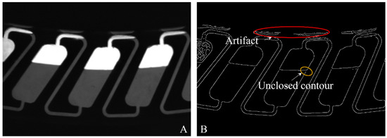 The binary image generated was examined for unclosed contours, according to Kovesi, and those gaps were filled [14]. For this purpose, a circular area with a radius of half the width of the gap to be closed (user-defined parameter) was created at the corner points of each edge segment. If two of these circles overlapped, they were reduced to a one-pixel-wide direct connection. On the other hand, the original edge was restored if there were no contact points. Besides the correction of unclosed contours, it was also necessary to eliminate artifacts in the binary image. These were caused by camera flash reflections in the viewing windows’ aluminum framing, which would interfere with further image processing.