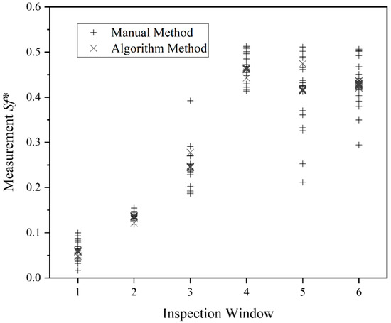 With higher mean Sf* values, the relative difference between the methods increases, whereby with Sf* values > 0.3, the 95 % confidence interval is exceeded in a few cases. Nevertheless, no significant systematic error can be identified, indicating an inconsistency in the measurement methods being compared. Considering Figure 5, the automated evaluation can be referred to as the new “gold standard” because of its significantly lower standard deviation. The angled cluster of data points for every inspection window (Figure 6, red ellipse marking the third inspection window as an example) is another indicator of the lower accuracy of the manual evaluation method. Such a pattern occurs for a collection of data points with a similar true value if one method’s precision is higher. For instance, if the manual method gives a value too low, while the automated method gives a value close to the true value, the mean value is shifted left, and the relative difference is shifted up (Section 3.3) and vice versa. However, if both methods show similar deviations from the true value, angled clusters like those in Figure 6 do not occur.