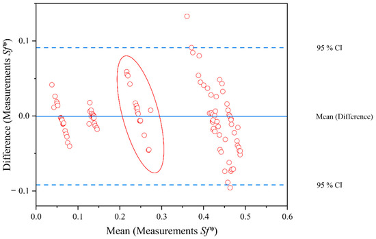 The relative difference of the retention values derived from the two measurement methods is plotted over the mean Sf*-value of both. It is noticeable that the variability of the evaluation methods for retention values in the range Sf* ≤ 0.3 is small (with values of +/− 0.06) and also lies within the 95% confidence interval (blue dashed lines) in all cases.