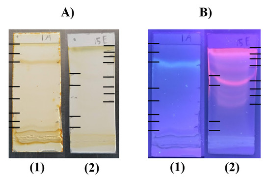 TLC separation of the AE and EE extracts of P. hysterophorus. The TLC plates were observed under visible light (A) and UV/Vis-365 nm (B), showing that the solvent systems EtOAc-MetOH-H2O (1) and CHCl3-MetOH-H2O (2) produced the major separation of components of the AE and EE, respectively.