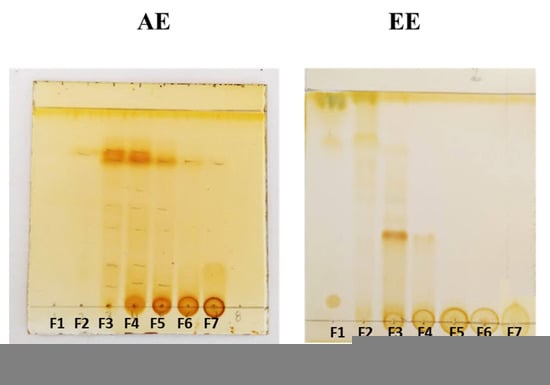 Once the yields of the fractions of the AE and EE were determined, their TLC separation patterns were evaluated (Figure 2). According to the results obtained, some fractions of the AE had similar Rf values, such as F3–F5 and F6–F7. However, these fractions did not show the same separation pattern due to the presence of some Rf values that were only identified in some fractions but not found in the others. In the case of the fractions of the EE extract, similar Rf values were also visualized in some of them, such as F2–F3 and F4–F5, but different Rf values were also detected. On the other hand, only the fractions F6 and F7 showed the same separation pattern (Table 5).