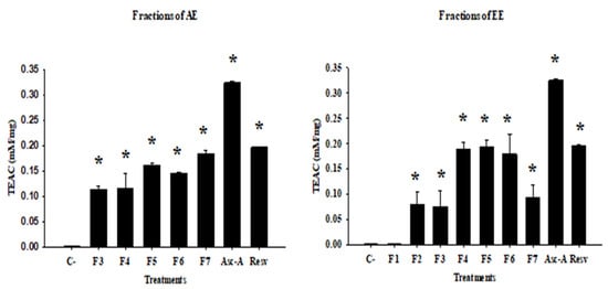 The antioxidant activity of the fractions of the AE and EE from P. hysterophorus was evaluated with the TEAC, DPPH, and -OH radical scavenging assays. These assays determine the capacity of a sample to inhibit radicals through the transference of protons or electrons [44]. In the TEAC assay, the results showed that the fractions F3–F7 of the AE produced a significant antioxidant activity, in the range from 0.114 ± 0.006 to 0.185 ± 0.006 mM/mg; thus, F7 has the highest antioxidant capacity. These results were higher than the antioxidant activity previously obtained by the AE (0.112 ± 0.001) [10]. However, these values were lower than the antioxidant capacity of Asc-A (0.325 ± 0.002 mM/mg) and Resv (0.197 ± 0.001 mM/mg). On the other hand, the fraction F1 of the EE did not have antioxidant activity (0 ± 0.002 mM/mg) but the fractions F2–F7 showed significant antioxidant effects. Among these fractions, F2, F3, and F7 exhibited values in a range from 0.076 ± 0.032 to 0.094 ± 0.024 mM/mg, which were lower than the antioxidant activity previously obtained by the EE (0.112 ± 0.013 mM/mg) [4]. However, the fractions F4–F6 exhibited a higher antioxidant capacity, with results in a range from 0.180 ± 0.038 to 0.195 ± 0.012 mM/mg and which were similar to the antioxidant activity of Resv (Figure 3).
