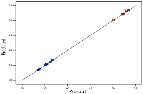 Furthermore, the F-value of the quadratic model was much higher (26,352.64) than the critical F-value at 95% confidence level for 9 degrees of freedom (3.179), which suggests that the selected model was significant. The adequacy of the quadratic model was also confirmed from the plot of the predicted response versus the actual response (Figure 2).