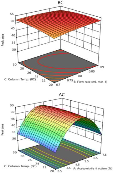 Three-dimensional response surface plots as a function of (BC): flow rate (mL min−1) and column temperature (°C) and (AC): acetonitrile fraction (%) and column temperature (°C) at 50 μg mL−1 concentration of ascorbic acid on the peak area.