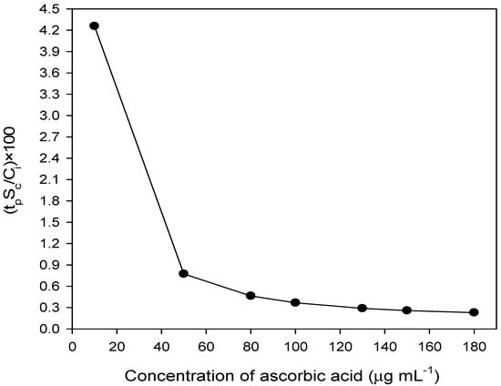where and ȳ are the average concentration of ascorbic acid and peak area, respectively at 7 different concentrations of ascorbic acid in 10–180 µg mL−1; and b and S0 are the slope and standard deviation of the calibration line, respectively. The uncertainty in the determination of ascorbic acid at 95% confidence level with 5 degrees of freedom was calculated and is shown in Figure 5. As can be seen from the figure, the least error of 0.143 μg mL−1 was achieved at 100 μg mL−1 of ascorbic acid, which demonstrates the acceptable precision of the proposed method.