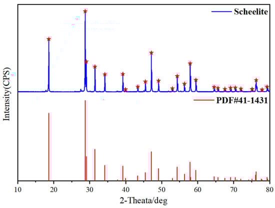 Pure mineral samples of scheelite from Yunnan Province, China were obtained by grinding in a ceramic grinding machine (Xiamen Chenggong Mining Equipment Co., Ltd., Sanming, China). Screening < 74 μm samples for experiments and testing. Mineral samples with a particle size of approximately 38 microns were taken for the determination of chemical composition and X-ray diffraction. The results recorded in Table 1 and Figure 1 show that the detected scheelite has high purity (>97%). BHA as a collector, MnCl2 as a Mn2+ source, and NaOH as a cosolvent (10%) were analytical-grade reagents. Pine alcohol oil was used as a frother. Deionized water (resistivity = 18.25 MΩ·cm) was used for experiments and testing.