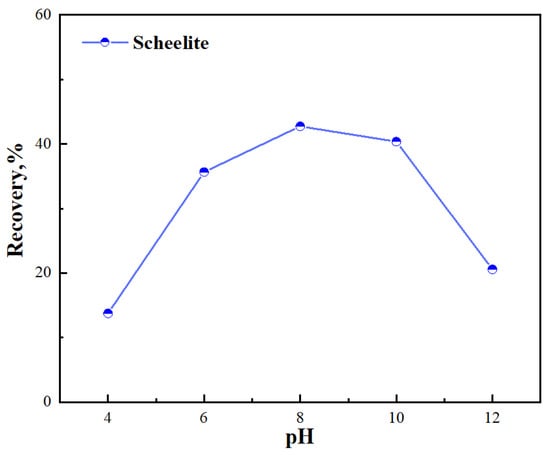 Before studying the effect of Mn2+, we first studied the effect of pulp pH on scheelite flotation in BHA system. The effects of pH on flotation recovery of scheelite at the BHA concentration of 1.0 × 10−3 mol/L were exhibited in Figure 2. The results showed that the best flotation index of scheelite was obtained in BHA system under alkaline conditions. The recovery rate between pH 8–10 was the highest, which was consistent with the previous research results [,]. Therefore, in subsequent experiments, we have chosen this pH range for the experiment.
