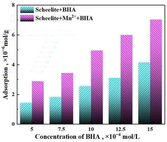 To further explored the flotation test results, the adsorption amount of BHA on the surface of scheelite was determined for different reagent systems, as described below. To study the effect of Mn2+ on the adsorption of BHA, the concentration of Mn2+ was set to 2 × 10−4 mol/L, and the concentration of BHA was increased (Figure 5, pink bars), giving a concomitant increased in the adsorption capacity of BHA that was greater than the increase with concentration of BHA observed in samples without Mn2+ (Figure 5, blue bars). In the range of 5.0 × 10−4 mol/L to 1.5 × 10−3 mol/L, the adsorption capacity increased from 1.44 mol/g to 4.16 mol/g. Moreover, the adsorption capacity of Mn2+ treated BHA on the surface of scheelite was significantly higher than that of the untreated one. In the same BHA concentration range, the adsorption capacity increased from 2.88 mol/g to 7.04 mol/g upon the addition of Mn2+. When the BHA concentrations were 1.25 × 10−3 mol/L and 1.5 × 10−3 mol/L, the adsorption capacity increased the most dramatically, up to 2.88 mol/g. The results, graphed in Figure 5, showed that the adsorption amount of BHA on the surface of scheelite increases with the increase in BHA concentration and increases further with the addition of Mn2+. In general, the addition of Mn2+ to a scheelite sample could reduce the dosage of BHA required to achieve a desired recovery relative to a sample with similar BHA adsorption capacity but with no Mn2+, which was consistent with the micro–flotation results.