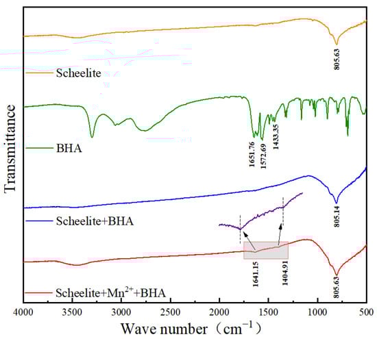 Different chemical bonds or functional groups have characteristic infrared absorption frequencies [,]. The mechanism of action of Mn2+ and BHA on the surface of scheelite can be studied by the detection of the characteristic frequencies of specific bonds or functional groups through infrared spectroscopy. The infrared spectra of samples of pure scheelite, pure BHA, scheelite with added BHA, and scheelite with added BHA and Mn2+ were shown in Figure 6.