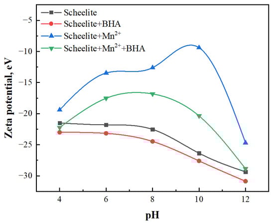 To further illustrated the effect of Mn2+ addition on the flotation behavior of scheelite, the surface zeta potentials were obtained for the four samples prepared as described in Section 2.5: pure scheelite; scheelite with added BHA; scheelite with added Mn2+; and scheelite with added Mn2+ and BHA. Figure 7 showed the zeta potential for each of these samples over a pH range of 4 through 12. The zeta potential of the scheelite in the absence of BHA and Mn2+ was −21.5 mV at pH = 4; as the pH increased, the potential gradually decreased. When the pH = 12, the potential dropped to −29.37 mV, which was consistent with the observations of previous researchers [], indicating that the negatively charged species in the solution were adsorbed on the surface of scheelite. After adding only BHA, the zeta potential had decreased to −23 mV at pH = 4. As the pH increased, the surface potential had been shifted negatively relative to that obtained in the absence of BHA. This was because the solution of C7H6NO2− adsorbed on the scheelite surface, causing the scheelite surface zeta potential negative shift, which proved that the scheelite surface could adsorb BHA [,]. After adding only Mn2+, the positively charged Mn2+ ions were adsorbed on the scheelite surface, causing a positive shift of the zeta potential; at pH = 10, the potential reached its highest value: −9.4 mV. In the presence of both Mn2+ and BHA, the zeta potential of the scheelite surface decreased significantly compared to that in the sample containing Mn2+ alone; again, the trend of decreasing zeta potential with increasing pH was observed, and the potential at pH = 10 was −20.37 mV. Compared to pure scheelite, after Mn2+ and BHA treatment of scheelite surface potential was on the rise. This indicated that the dominant species adsorbed on the surface of scheelite were positively charged []. combined with infrared spectroscopy, the surface of scheelite should be Mn-BHA adsorption, and this adsorption is stronger than the BHA alone. The zeta potential difference between the samples with and without BHA was only −1.23 mV at pH = 10, but in the presence of Mn2+, the corresponding potential difference between the samples with and without BHA increased significantly, reaching −10.97 mV. The results of the zeta potential analysis indicated that more BHA could be adsorbed on the scheelite surface after adding Mn2+, which was consistent with the UV results and the micro−flotation results.
