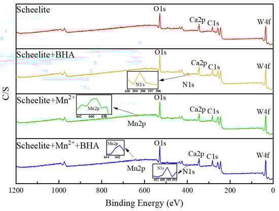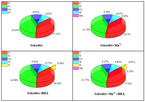 The above techniques revealed the effect of substituents on the mineral surface of scheelite on flotation behavior after interaction with reagents. XPS testing was conducted to obtain detailed chemical information about the presence of various elements and the mineral surface composition. Therefore, we carried out XPS detection to illustrate the adsorption mechanism of Mn2+ and BHA on the surface of scheelite. Figure 8 showed the full XPS spectra for the four samples under study, and Figure 9 presented pie charts of the relative atomic composition of the surfaces of each sample. The four samples analyzed were prepared as described in Section 2.6: pure scheelite; scheelite with added BHA; scheelite with added Mn2+; and scheelite with added Mn2+ and BHA.