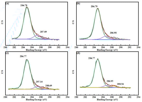 C 1 s XPS spectra on the surface of (a) pure scheelite, (b) scheelite with added Mn2+, (c) scheelite with added BHA, and (d) scheelite with added Mn2+ and BHA.