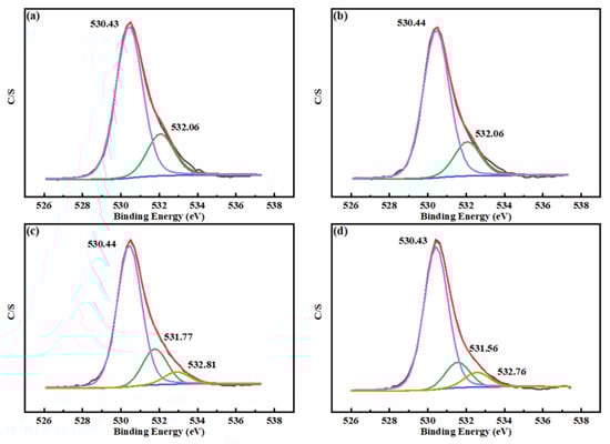 O 1 s XPS spectra on the surface of (a) pure scheelite, (b) scheelite with added Mn2+, (c) scheelite with added BHA, and (d) scheelite with added Mn2+ and BHA.