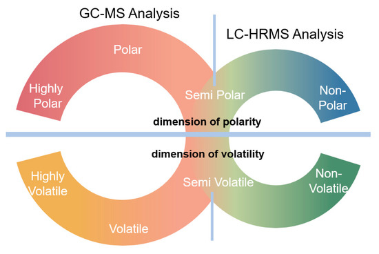 As previously described [39], two semi-quantitative non-targeted analytical methods were implemented to provide a more complete list of aerosol chemical constituents. These NTA methods were developed for the detection and identification of chemical constituents from covering a wide range of chemical space (Figure 1). The LC-HRMS system consisted of a Q-Exactive Orbitrap mass spectrometer (Thermo, Waltham, MA) coupled to a Vanquish Horizon-Class liquid chromatograph with an autosampler and heated column compartment (Thermo). Sample introduction and chromatographic separation was performed on 100 nL of sample using a Waters BEH C18 (2.1 × 100 mm, 1.7 µm) column with a mobile phase gradient. Full scan data were collected across M/Z 60–800 at resolving power 140,000. Data-dependent MS/MS fragments were generated by collision of 3 arbitrary energies and mass spectra were collected from M/Z 60–800 with a resolving power of 17,500. The GC-MS systems consisted of an Agilent 7890GC/5977MSD gas chromatograph equipped with an electron ionization source. The separation was performed on 1 uL of sample using a Restek Stabilwax (30 m × 0.25 mm × 0.25 μm) column with a Restek (5 m) integra guard column, using an oven program and an inlet split ratio of 5:1. Full scan data were collected across M/Z 35–450 at unit resolving power. Fragments were generated using electron impact ionization at 70 eV. The Supplemental Tables S1–S3 contain full details on the LC and MS instrument parameters.