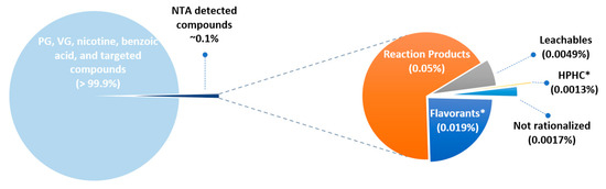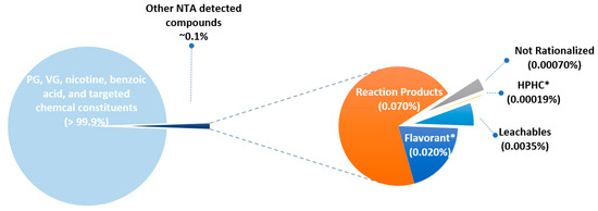 The number of chemical constituents detected using the LC and/or GC NTA methods from non-intense puffing was slightly lower than the number of chemical constituents detected using the intense regimen. However, the average mass under non-intense puffing was higher than the intense regimen. Approximately 25% of the mass was attributed to flavorants, making this category represent the second highest percentage by mass and by number of chemical constituents. Considering both puffing regimens, there were nine chemical constituents categorized as leachable. Most of the chemical constituents determined to be reaction products were associated with PG-, VG- or nicotine-related degradation.