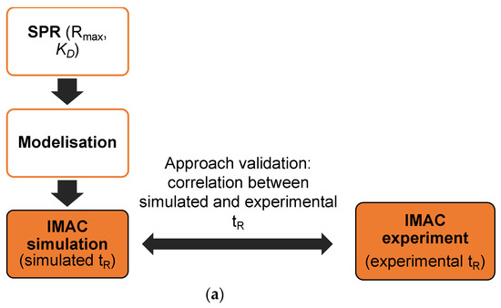 A simulation of Metal-Chelating peptides separation in IMAC (a) considering the analogy between IMAC and SPR (similar support, metal, complexing agent) (b). tR retention time; Rmax maximum Response; KD Constant of dissociation.