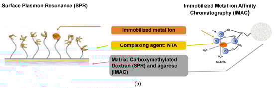 IMAC has three main parts [82]: the matrix (e.g., cellulose, silica, agarose) fixed via spacer arms to the chelating agents (e.g., iminodiacetic acid (IDA), nitrilotriacetic acid (NTA)), onto which are immobilized the metal ions (e.g., Ni2+, Cu2+, Fe2+, Co2+). Each specific constituent of the IMAC chromatographic phase is detailed hereafter.