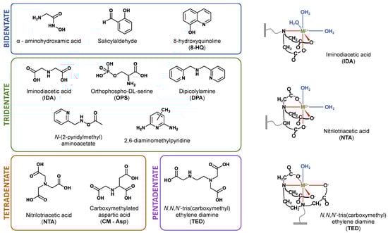 In IMAC, complexing or chelating agents immobilize the metal ions by complex formation. Each agent is characterized by a coordination number/denticity, a specific charge, steric bulk and chirality [82], which directly influence the binding of metal ions-molecules of interest. According to the coordination geometry, the complex agent is characterized as monodentate, bidentate, and so on [6,97]. Four types of complexing agents were principally investigated, depending on their denticity (Figure 2): bidentate (e.g., aminohydroxamic acid, salicylaldehyde, 8-hydroxyquinoline (8-HQ)), tridentate (e.g., IDA [93], dipicolylamine (DPA), ortho-phosphoserine (OPS), N-(2-pyridylmethyl)aminoacetate, 2,6-diamino methylpyridine), tetradentate (e.g., NTA [79,98], carboxymethylated aspartic acid (CM-Asp) [99] or pentadentate (e.g., N,N,N′-tris(carboxymethyl) ethylene diamine (TED) [100].