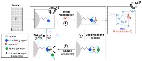 IMAC is based on the affinity of each targeted peptide/protein with metal ions immobilized on the matrix [79,81,82,104], and interactions that occur between a peptide and a metal ion are developed in Section 2.4. Globally, biomolecules are first adsorbed and then desorbed (elution) [97]. IMAC comprises these main steps: column equilibration with buffer solutions, sample loading followed by washing to remove the unbound components, elution of bound components, column stripping and regeneration with the metal (Figure 3).