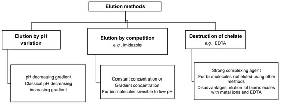 The targeted proteins/peptides are eluted from the column in three various ways: either acting on the pH, using a competitor agent, or by destructing the chelates [6,79], as described hereafter (Figure 4).