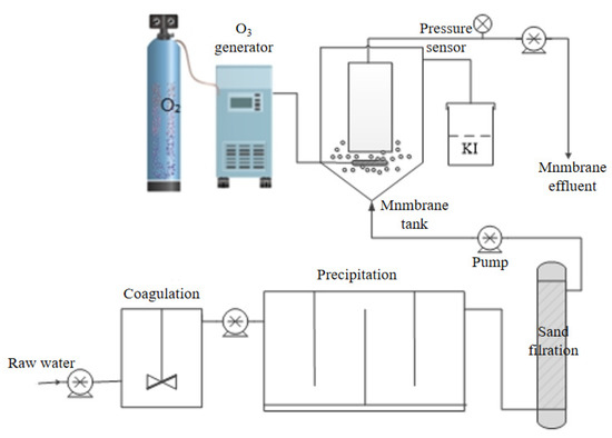 Not only can in situ catalytic ozonation and the membrane filtration process can not only retain NOMs, bacteria and other organic mixture matter, but they can also remove or degrade emerging organic pollutants in water, and it is for these reasons that its application in the field of advanced surface water treatment for good-quality drinking water has gradually increased in recent years [2,3]. However, some researchers have discovered that [4,5], when the transmembrane pressure is rapidly increased this results in the ceramic membrane needing to be continuously cleaned at its actual surface during water treatment with the combined catalytic ozonation and membrane filtration process. This is due to raw water containing numerous NOMs, which can block the pore or channel of the ceramic membrane and greatly increasing the cost of water treatment. Therefore, it is necessary to explore a novel and efficient method that can shorten the membrane cleaning cycle. The pretreated methods, such as coagulation–precipitation–sand filtration, can remove some macromolecular suspended solids, colloidal substances, dissolved organic substances, etc., in the raw water, which can reduce the pressure on the ceramic membrane filtration [7,8]. In addition, the oxidation degradation rate and the ability of the combined catalytic ozonation and membrane filtration process are influenced by the operation conditions, such as ozone concentration and flow velocity, which have a significant effect on the formation of membrane fouling. Consequently, a suitable pretreated method and operation conditions should be determined, and their influence mechanism on the membrane fouling also needs to be further studied.