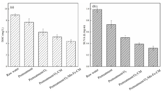 The most commonly used parameters that can represent NOM, DOC and SUVA are considered to be closely related to membrane fouling. Generally speaking, surface water with a high SUVA content often contains some hydrophobic organics, e.g., aromatic organics, etc. Water with higher values of SUVA indicates a higher possibility for resulting in membrane fouling [11]. The change in DOC and SUVA concentrations in the effluent of the different combined treatment process is shown in Figure 2. When compared with the initial influent, the concentrations of DOC and SUVA in the effluent of the coagulation–precipitation–sand filtration pretreated system were reduced by 14.2% and 26.7%, respectively. The in situ ozonation/Mn-Fe-CM filtration system (O3/Mn-Fe-CM) removal performance without pretreatment for DOC and SUVA were 44.6% and 58.6%, respectively. The addition of in-situ ozonation and the ceramic membrane filtration process after pretreatment further reduced the DOC and SUVA concentrations. Among these combined treatment systems, the combined pretreatment process and the in situ ozonation/Mn-Fe-CM filtration system (Pretreatment/O3/Mn-Fe-CM) possessed the best removal performance for DOC (51.1%) and SUVA (67.9%). This was because the interception function of the ceramic membrane channel, and the adsorption or electrostatic interaction on the membrane surface or pores, further increased the removal efficiency of organic matters. On the other hand, based on the results of the quenching experiments and EPR tests [7] (shown in Figures S7 and S8) in our previous study, it can be concluded that the direct oxidation of O3 and the O3 adsorbed onto the ceramic membrane surface was promoted by Mn-Fe-CM catalytic ozone oxidation, which generates a series of chain reactions to produce more OH and 1O2, which can degrade more macromolecular organic matters of NOMs into smaller molecular substances, even to CO2 and H2O [10]. The synergistic effect enhanced the removal of organic matter [4,6]. Additionally, the loaded MnFeOx made the ceramic membrane possess a stronger adsorption and catalytic ability, resulting in the best removal performance of the Pretreatment/O3/Mn-Fe-CM system. When compared with the pristine O3/Mn-Fe-CM system, the ratios of DOC and SUVA were increased by 6.5% and 9.3%, respectively, which might be due to some organic compounds containing unsaturated bonds and aromatic bonds that can be appropriately removed by the pretreatment of raw water [11]. Additionally, the removal of TMP in the Pretreatment/O3/Mn-Fe-CM system is shown in Figure S4.