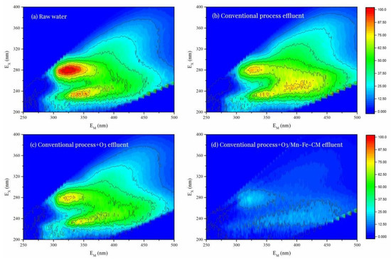 EEM characteristics of effluent along the route, (a) the raw water, (b) the conventional process effluent, (c) the conventional process+O3 effluent, (d) the conventional process+O3/Mn-Fe-CM effluent.