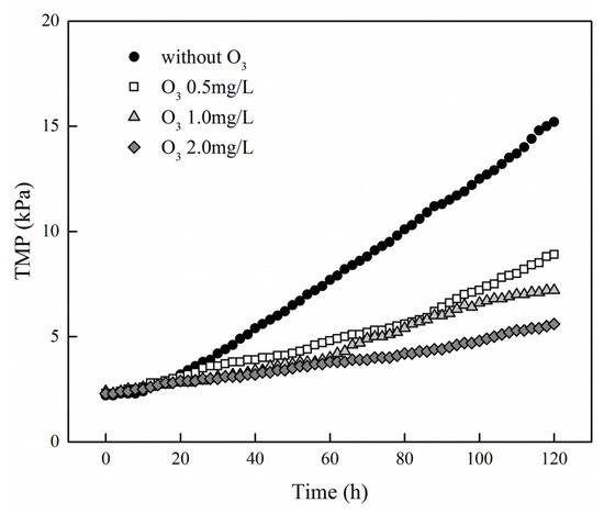 Transmembrane pressure of Mn-Fe-CM under different ozone concentrations in the combined process.