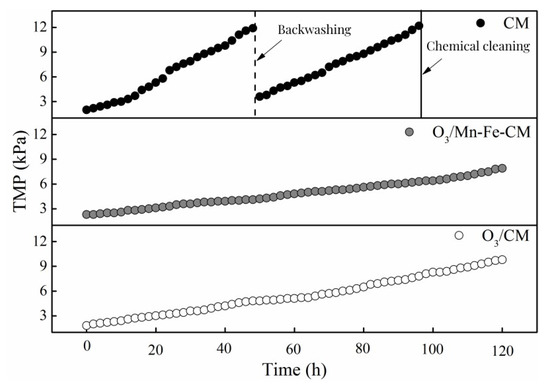 As shown in Figure 5, the transmembrane pressure of the Pretreatment/CM system was increased to 12.0 kPa after 40 h without ozone oxidation. If the membrane was not regularly rinsed, the transmembrane pressure would increase faster, indicating that the formation rate of membrane fouling in the Pretreatment/CM system was relatively quick [19,20]. After adding ozone (0.5 mg·L−1), the transmembrane pressure in both the Pretreatment/O3/CM and the Pretreatment/O3/Mn-Fe-CM systems was only increased to 9.8 kPa and 7.9 kPa, respectively, after a long-term operating time of 120 h. The membrane working time for one time was approximately three times that of the Pretreatment/CM system without the in situ ozonation treatment. According to the flat curve for the growth of the transmembrane pressure, it can be speculated that the generation rate of membrane fouling in both the Pretreatment/O3/CM and the Pretreatment/O3/Mn-Fe-CM systems was quite slower than the Pretreatment/CM system, especially for the Pretreatment/O3/Mn-Fe-CM system. The nano-scale porous structure of the ceramic membrane can increase the contact probability and the reaction time of the ozone and organic pollutants, thereby enhancing the degradation of the macromolecule organic pollutants, which increases a proportion of the reversible pollution to a large extent, making the membrane flux easier to be recovered by a hydraulic backwashing [16,17,18]. Our previous study showed that organic matter was not only oxidized in the reactor, but also degraded in the membrane pores [19]. Due to the stronger ability of Mn-Fe-CM for catalyzing ozone, more free radicals can be immediately generated in the inner interface of the membrane pores, which accelerates the decomposition rate and the extent of the adsorbed organic pollutants in the membrane channels. In this way, the degraded macromolecules easily fell away from the ceramic membrane and the flow resistance induced by the fouling layer in the membrane channel was reduced. All these changes further alleviated membrane fouling in the Pretreatment/O3/Mn-Fe-CM system [20]. Generally speaking, the combined in situ ozonation and the ceramic membrane with a catalytic function greatly alleviates membrane pollution during the drinking water ultrafiltration process and prolongs the working time of the membrane.