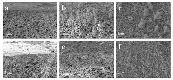 SEM characterization of ceramic membranes before and after use in the combined process: (a,d) are the cross-sections of CM and Mn-Fe-CM before use, (b,e) are the cross-sections of CM and Mn-Fe-CM after use, (c,f) are the surfaces of CM and Mn-Fe-CM after use.