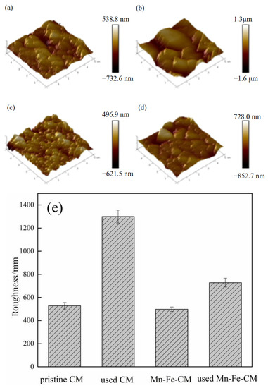 AFM characterization of ceramic membranes before and after use in the combined process: (a,c) CM and Mn-Fe-CM before use; (b,d) CM and Mn-Fe-CM after use, (e) roughness variation.